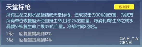 群体攻击技能,伤害不高,对敌方全体造成攻击力30%的伤害,但是会为我方所有数码宝贝恢复座天使兽自身12%的血量,并且每有一颗生命之树水晶会再为群体增加座天使兽3%的血量,生命之树水晶越多,为我方数码宝贝恢复的血量越多。