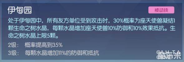 被动技能,所有友方数码宝贝被攻击时,有30%的概率凝结1颗生命之树水晶,每有一颗水晶将会增加座天使兽的10%的防御和10%效果抵抗,水晶越多,座天使兽的防御力和对敌方效果的抵抗力就越高。但是生命之树水晶最多凝结5颗。