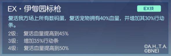 EX技能,复活我方所有死亡的数码宝贝,并恢复它们自身生命值的40%血量,且再增加30%的行动条。在对抗中,行动条越多,出手攻击的速度就越快。那么,一旦恢复生命,数码宝贝将很快进行出手攻击进而扭转局面。