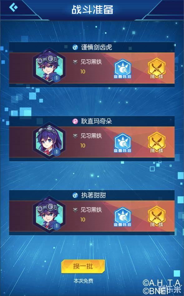 初始期的挑战可以搜寻到同阶段的玩家。查看对方的数码宝贝阵容,并根据对方的阵容来改变自己的阵容,如果不想挑战可以换一批玩家,第一次更换免费,之后的更换都需要耗费5个钻石。