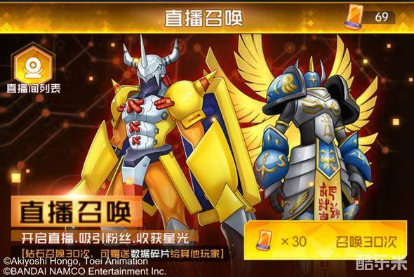 召唤是获取数码宝贝的重要方式之一,直播召唤需要消耗30张直播召唤券或者5400钻石开启,随机获得30只数码宝贝,稀有度最低为R,最高为SSR。
