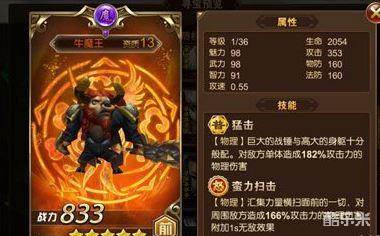 牛魔王的普攻技能是对敌方单体造成巨大的物理伤害,是一个不错的单秒技能;怒气技能是一个扇形AOE技能并附带1秒的无敌效果,是一个好T的象征。