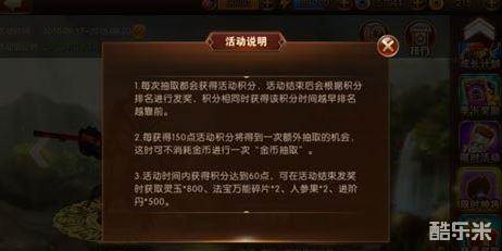 抽取每次会增加10积分,每到达150积分会获得一次免费的金币抽取!钱不扣,积分照加,这个请大家注意了。只要玩家积分到达60分,就可以额外获得:灵玉X800,万能法宝碎片X2,人生果X2,进阶丹X500.;我们有3次免费的抽取机会也就是30积分,实际上我们只要花840金,就可以获得这些奖励。对于一些不想抽取神将的朋友,可以试着抽取3次来获得这些诱人的奖励。