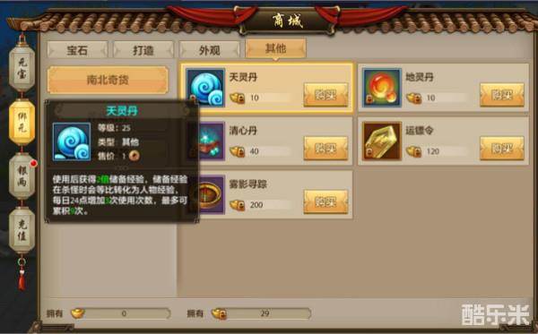 这个时候可以选择在商城中购买天灵丹,25级以上的玩家可以使用,可以获得一定的双倍经验,10元宝1个,绑定元宝同样可以购买,每天可以使用三个。使用过之后,可以去将每日前50个夺宝马贼活动做完,拥有天灵丹的效果,夺宝马贼的经验是双倍的。
