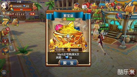 当玩家角色达到5级后,游戏界面上方的聚宝盆会自动点亮,点击【聚宝盆】即可进入。每天第一次使用聚宝盆即可消耗10钻石来兑换1W金币,每多兑换一次则要多消耗2钻石。