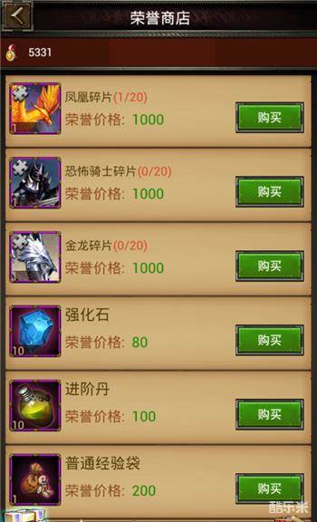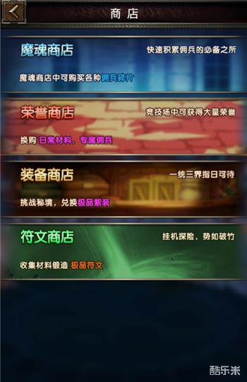 荣誉商店:出售日常材料及专属紫色佣兵、装备碎片。日常材料包括强化石、进阶丹、经验袋。可通过荣誉值购买,在竞技场中可获得大量的荣誉值。