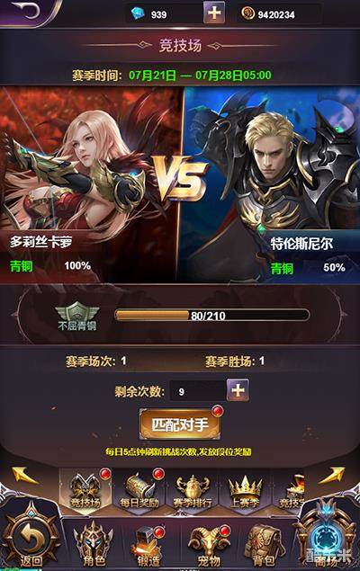 竞技场的规则十分简单,每天可以匹配10次对手。战胜对手即可获得荣誉。至于战败的一方,对不起,败者不应该得到奖励。想要荣誉,就努力提高你的实力吧!