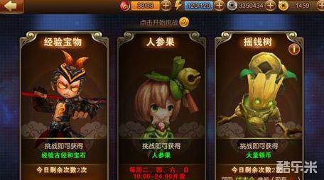 整体的历练之地总共分为三个副本,玩家进入不同的副本可获得不同的奖励内容——进入历练之地界面中,游戏包含了三类型的副本,其中包括经验宝物、人参果、以及摇钱树;这三个副本除了“人参果”需要在特定时间开启,其余的类型玩家每天都需要按照功课体验进行完成。