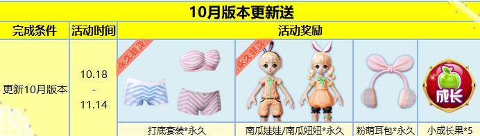 10.18-11.14,更新版本登录游戏即送10月版本全新打底套装,还有永久万圣节宝儿套装+粉萌耳包!心动不如行动,记得按时更新版本并登录游戏领取奖励哟~