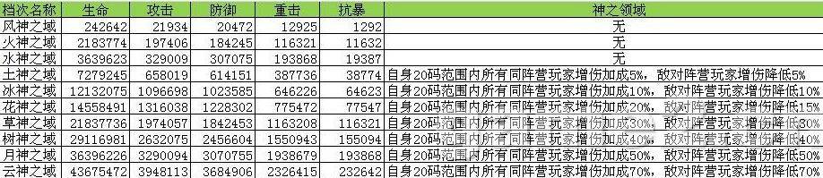 成功唤醒神域,不仅可获得强大的属性加成,除了生命、攻击、防御、重击等基本属性之外,更附加抗暴、增伤、减伤特殊属性。具体属性加成如下图所示: