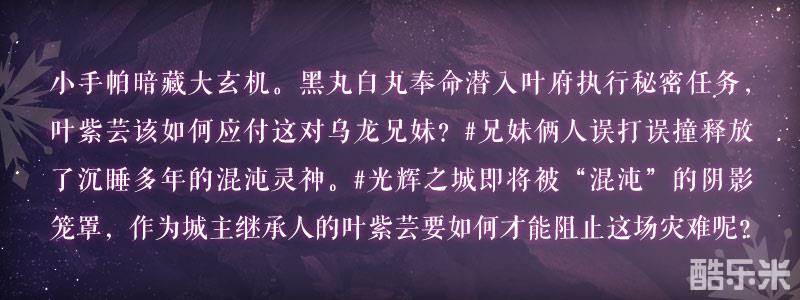 本次“风雪的嫁衣”活动剧本,由《妖神记》原著作者发飙的蜗牛全程监修,讲述了小手帕暗藏大玄机。黑丸白丸奉命潜入叶府执行秘密任务,叶紫芸该如何应付这对乌龙兄妹?兄妹两人误打误撞释放了沉睡多年的混沌灵神。光辉之城即将被“混沌”的阴影笼罩,作为城主继承人的叶紫芸要如何才能阻止这场灾难呢?