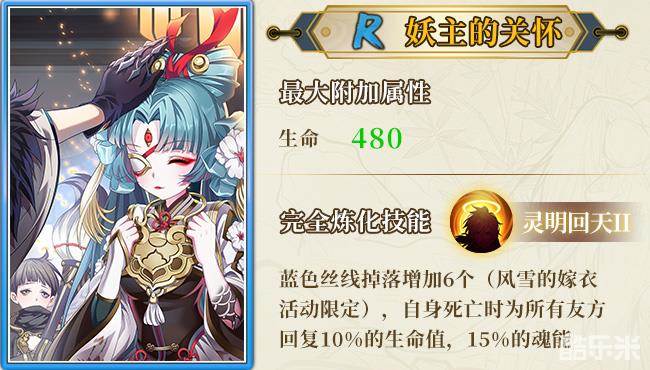 限定SSR妖灵师——死亡灵神也作为风雪的嫁衣的重头戏登场啦!作为唯一的法术伤害召唤,她的绝技终末馈赠,不仅可以对敌方前排造成大量伤害,还可以为我方施加“终末馈赠”状态!是召唤流玩法中必不可少的核心妖灵师。死亡灵神是风雪的嫁衣活动期间的限定UP妖灵师,喜欢她的玩家们千万不要错过这次机会哦!