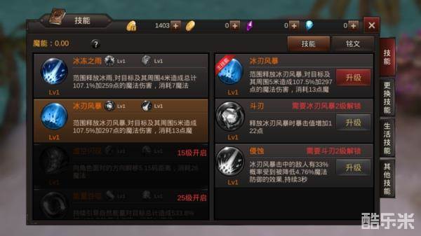 冰刃风暴:范围释放冰刃风暴,对目标及周围造成魔法伤害。“斗刃”可以在释放“烈焰飞舞”的时候增加技能的暴击值,“侵蚀”能够在技能释放后,降低敌人的魔法防御