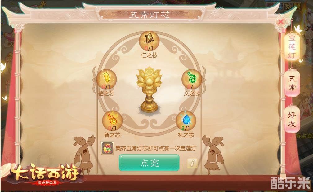 各位少侠通过完成游戏内活跃度任务,就能够与好友进行特别的互动了。在6个活跃度奖励中,玩家有机会获得“仁、义、礼、智、信”其中随机的1个五常灯芯,好友可以从“仁、义、礼、智、信”五个方面对你进行评价,每天每人只能对一个玩家评价一次。当天一个方向的数值达到10个,则获得1个该方向的灯芯;每天最多获评价15次。