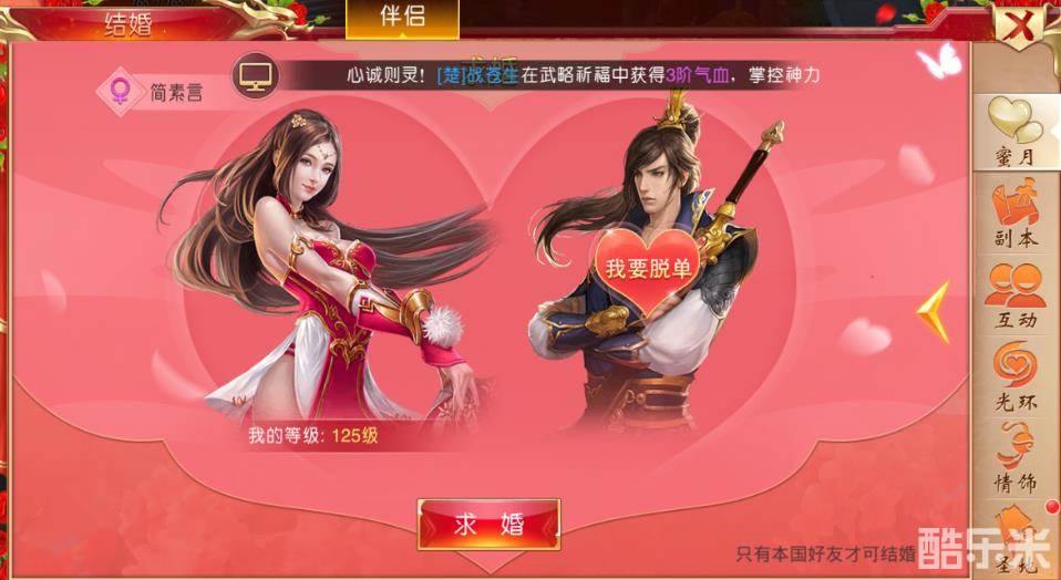 梦里寻Ta千百度,蓦然回首,那人却在灯火阑珊处。在《战国之道》既有逐鹿中原的热血激情又怎能少得了与意中人邂逅的柔情似水。,对于有缘相遇的玩家而言,如果两人能比翼齐飞,并肩作战,岂不美哉?为此游戏里专门设计了结婚系统,不仅让玩家们可以在游戏里结成眷侣,还能获得多种福利和强化,一起来看看吧!