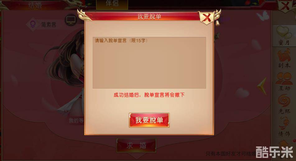 在游戏里有缘的玩家可以结为伴侣,那么缘分未到的单身玩家怎么办呢?不要急,结婚系统早早考虑到了这一点。玩家在结婚系统里可以发布自己的心动宣言,其他玩家会根据心动宣言选择是否成为该玩家的追求者,获得追求者的玩家可选择与其中一人结成伴侣。注意!只有70级以上的玩家才能发布心动宣言哦。