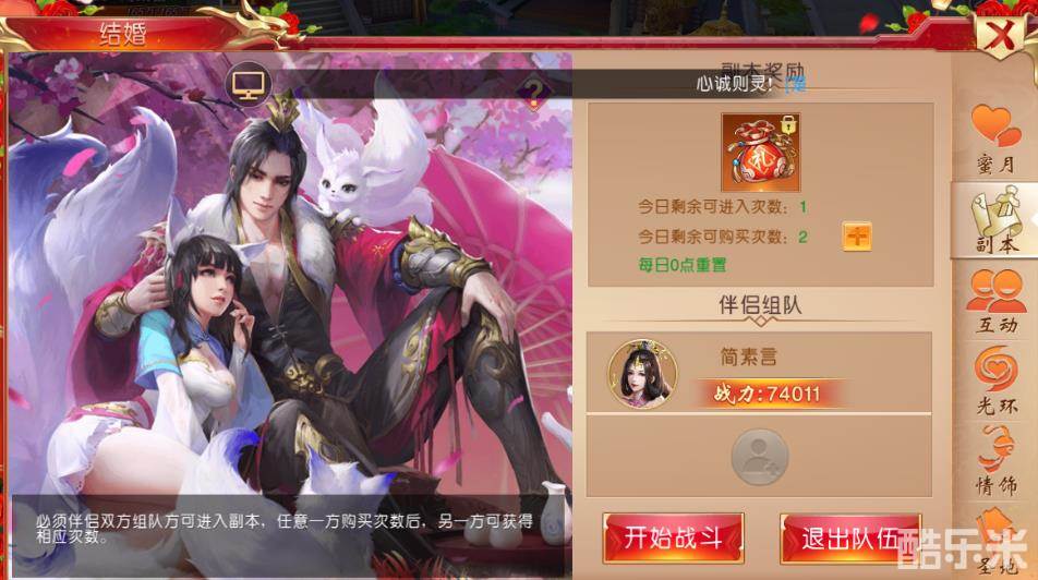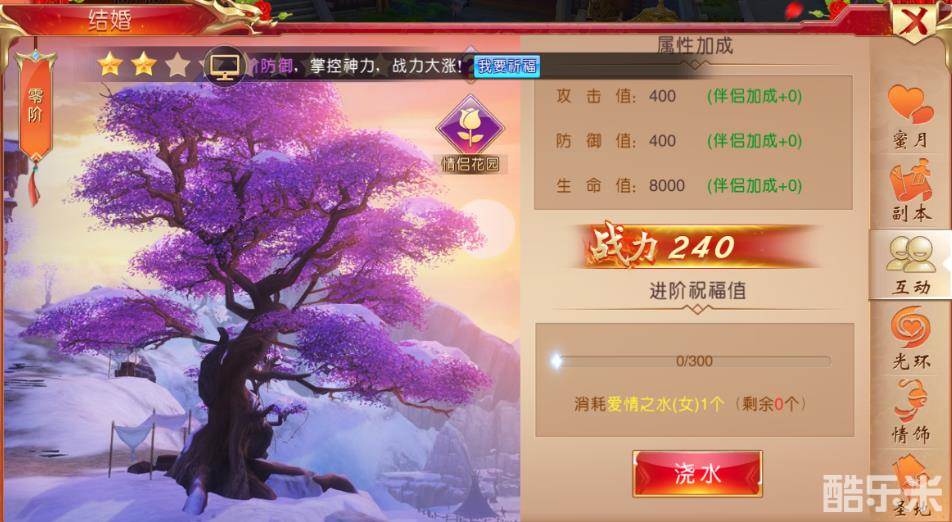 结婚系统拥有情侣花园、情侣圣地、情侣光环、情侣副本、情饰等四种功能。伴侣玩家培养情侣花园会得到爱情果实,升阶后可提高玩家属性。情缘圣地和情侣副本是伴侣玩家专属的副本,玩家通关副本会获得鲜花奖励。鲜花可以增加伴侣间的亲密度,增加玩家的属性。