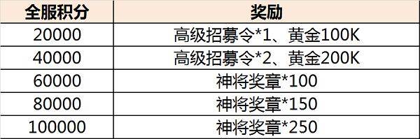 活动期间内进行将领招募会计入全服积分,全服总计达到对应积分,所有人可领取奖励。