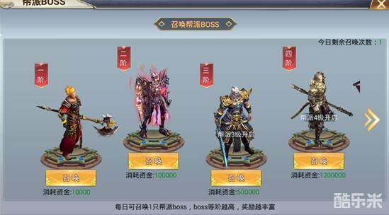 “帮派BOSS”每天可以进行召唤,BOSS一共分为十个等阶,等阶越高的BOSS战斗力就越可怕。帮主或副帮主每天可以召唤1次BOSS让大家挑战,众帮友群起而攻之,击败了穷凶极恶的BOSS后按照伤害百分比,给每一位帮派成员发放绑定元宝和大量的铜钱奖励!