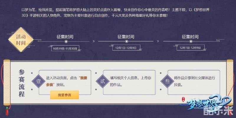 即日起至12月7日,登录《梦想世界3D》官网“同人创作大赛”专题页面,点击“我要参赛”按钮,填写相关个人信息并完成上传,即可成功参与比赛。千元大奖及海量好礼等你来拿噢!
