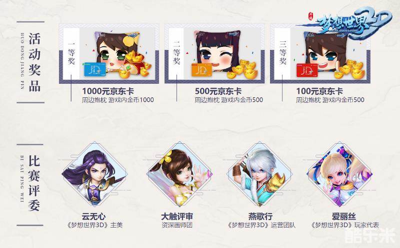 10月19日至11月30日,同人绘画大赛率先开启作品征集。在《梦想世界3D》的世界里,每个角色都有属于自己的精彩故事。在本次大赛中,参赛选手以游戏内的主角以及各宠物为素材进行创作,本次绘画大赛奖品包括1000元京东卡、海量金币、游戏周边抱枕等。只要热爱,少侠们请尽情发挥,用画笔将你心中的故事勾勒于纸上。