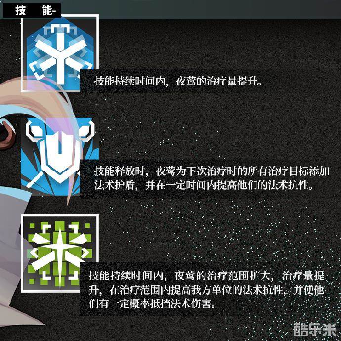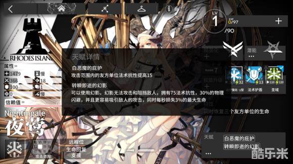 夜莺的个人天赋为“白恶魔的庇护”,非精英化时只能小幅度提升攻击范围内的友军单位的法术抗性。