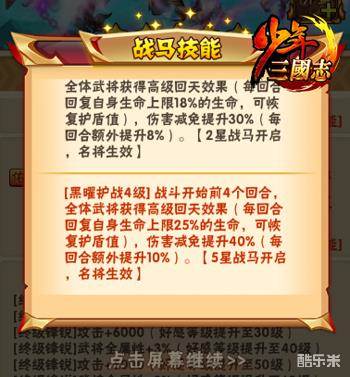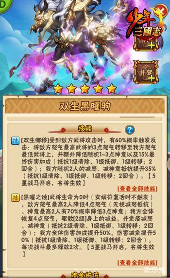 《少年三国志》手游将于今日迎来游戏内最高品质的战马之一——双生黑曜驹。它可在战斗中对敌军释放强力的怒气、神意控制技能,还能提升我方全体武将的生命值与伤害减免。今日双生黑曜驹技能大曝光,一起来了解下吧!