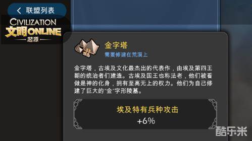 说起古埃及就不得不提起它的标志性建筑——金字塔,它是埃及人对永恒观念的一种崇拜。据说在建造胡夫金字塔时,胡夫强迫所有的埃及人为他做工,奴隶借助畜力和滚木,把巨石运到建筑地点的,又将场地四周天然的沙土堆成斜坡,把巨石沿着斜坡拉上金字塔。就这样,堆一层坡,砌一层石,逐渐加高金字塔。建造胡夫金字塔花了整整20年的时间。在游戏中,作为奇迹建筑的金字塔将由联盟自行建造,建造的位置需要选在荒漠上,联盟的伙伴们就要精心设计征服路线,避免和计划产生冲突。
