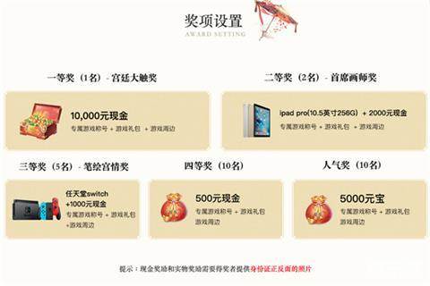 一等奖 宫廷大触奖(1名):10,000元+专属游戏称号+游戏礼包+游戏周边