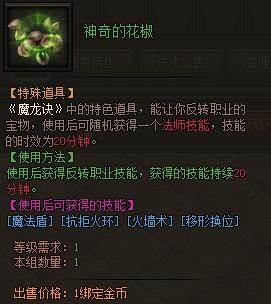 魔龙诀野外怪物有几率掉落神奇的花椒,使用后能随机获得一个法师技能,技能存在时间为20分钟。