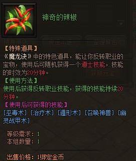 魔龙诀野外怪物有几率掉落神奇的辣椒,使用后能随机获得一个道士技能,技能存在时间为20分钟。