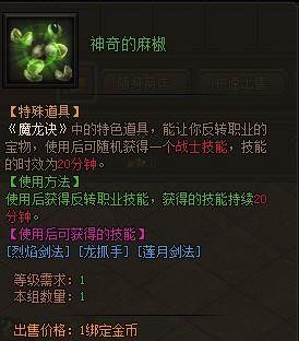 魔龙诀野外怪物有几率掉落神奇的麻椒,使用后能随机获得一个战士技能,技能存在时间为20分钟。