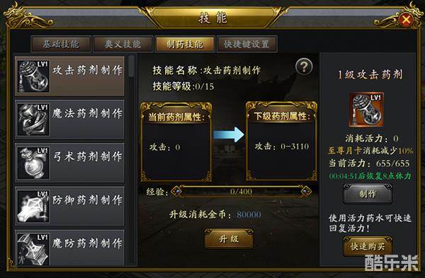 当活力足够时,可以制作相应等级攻击药剂:(活力不足怎么办?活力值在线即可增长,而且制药技能等级越高活力值增长得就越快!)