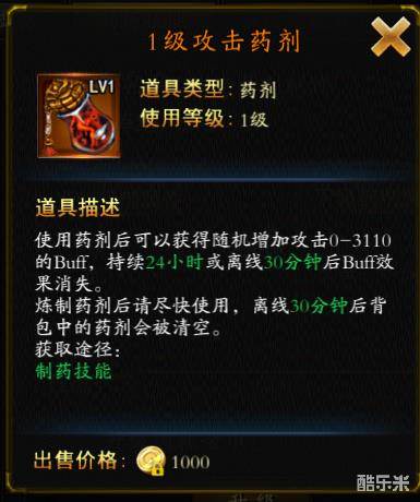 药剂使用后可以获得随机范围内数值的攻击属性,持续24小时,离线30分钟后消失(药剂和BUFF都是这个有效期哦,所以制作药剂后就尽快使用吧!)