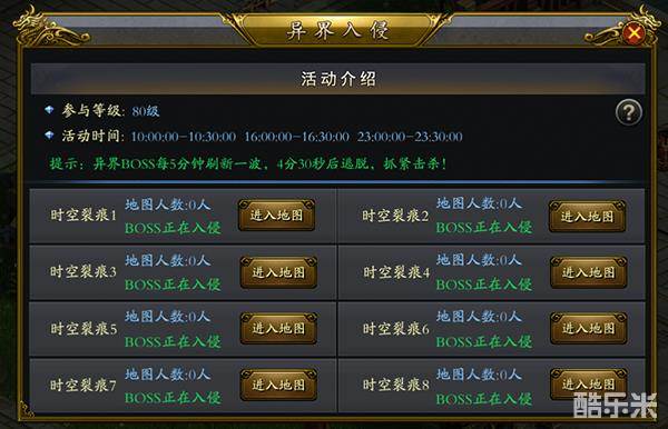 异界BOSS每5分钟入侵一波,4分30秒后没有杀死则会逃脱;时空裂痕共有8个,为组队PK模式;逃脱和入侵前会有倒计时提示。