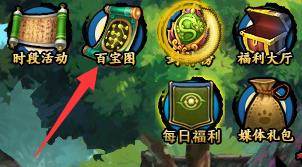 百宝图是法宝及法宝碎片的主要获取途径。当百宝图玩法解锁后,玩家可进入到百宝图中,使用寻宝的方法来获取各种法宝和法宝碎片。点击右上角的“百宝图”按钮,即可跳转到百宝图系统。