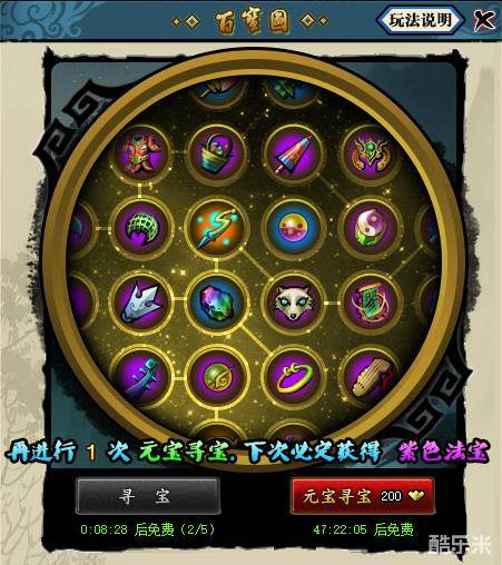 在百宝图中,玩家每天可免费寻宝5次,用完免费次数后,可使用元宝继续寻宝。当玩家使用元宝寻宝时,每寻宝2次必得一个紫色法宝。若寻宝过程中出现重复的法宝,系统会将其自动转化为对应的法宝碎片。