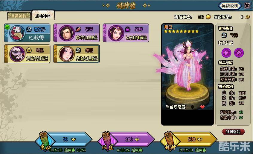 神将紧随于主角之后,是主角进行封神冒险的最佳队友。在游戏中,神将分为甲、锐、羽、法四种类型。其中金甲类神将拥有最高的体魄资质,是最强肉盾;锋锐类神将攻守兼备,擅长突进;飞羽类神将射程最远,是最强输出;控法类神将拥有光环技能,是最佳辅助。