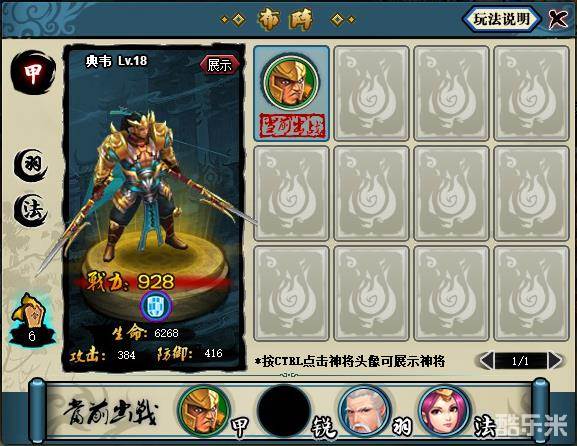 每场战斗最多有4个神将出战,在神将上阵之前,玩家可通过角色或布阵系统来了解神将总战力和各项属性所占比例。因为每次遇到的敌人都可能有变化,所以玩家最好每个类型的神将都培养一个,然后再培养几个控法和飞羽类型的神将。