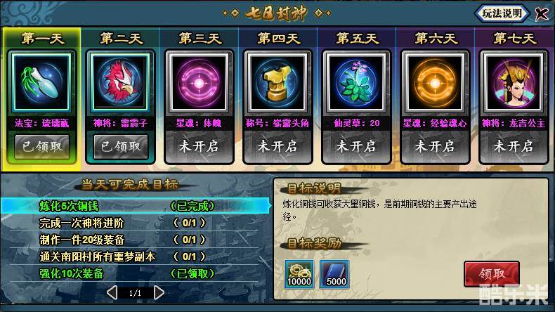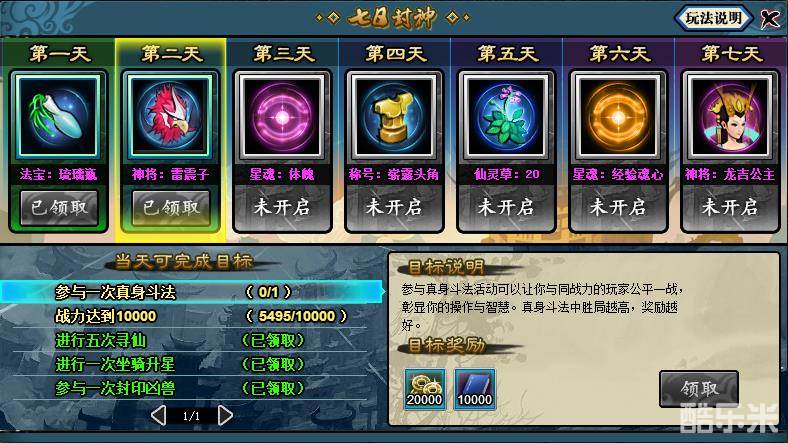 七日封神是新手必做的一个活动。新手完成七日封神中的各种目标,可获得大量铜钱与阅历,完成一天的所有目标后,还能拿到获得当日的最终奖励。最终奖励的奖品种类丰富,不仅有道具、法宝、神将,还有珍贵的主角称号。