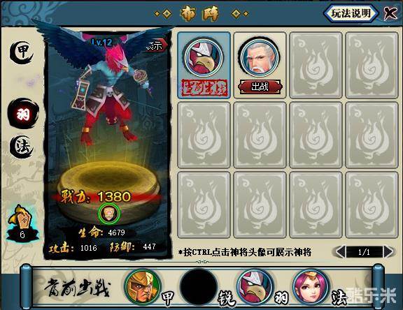 神将阵容会大大影响战斗的质量,即便是战力相同,不同的阵容呈现出来的战斗效果也有着一定的差别,所以战前的布阵显得十分重要。这个游戏的布阵规则相对简单很多,每个类型的神将都可以且至多只能上阵一个,所以玩家不必考虑如何搭配神将类型,只要在同一类神将中比较哪个更强即可。