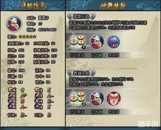 在布阵界面左侧有神将的详细信息,然后信息最下方是这位神将对各类神将的对抗评价。通过这些评价,玩家就可以知道这位神将适合对抗哪些敌人,可以在哪一种战斗中出场。虽然战斗的胜负受很多因素影响,但在同级的战斗中,这样的判断就足够主导战场了。