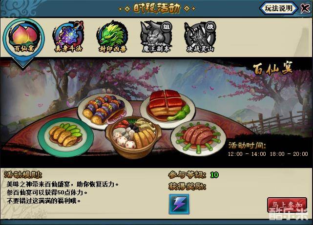 参与百仙宴首先要进入时段活动系统中,点击界面上方的“时段活动”按钮即可。进入到时段活动后,第一个活动图标就是百仙宴,点击之后玩家可进入到百仙宴的活动界面,然后再点击百仙宴活动界面下方的“马上参加”按钮,即可领取体力值。