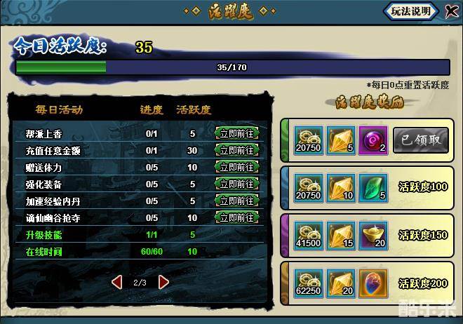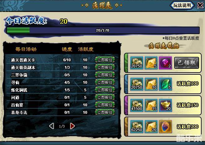 完成每日活动中的指定任务可提升活跃度,当活跃度达到一定数值时,可领取对应的活跃奖励。活跃奖励有4档,每档奖励都有所不同,不过随着档次增加,活跃奖励会逐渐增多。最后一档的领取条件是达到200活跃值。