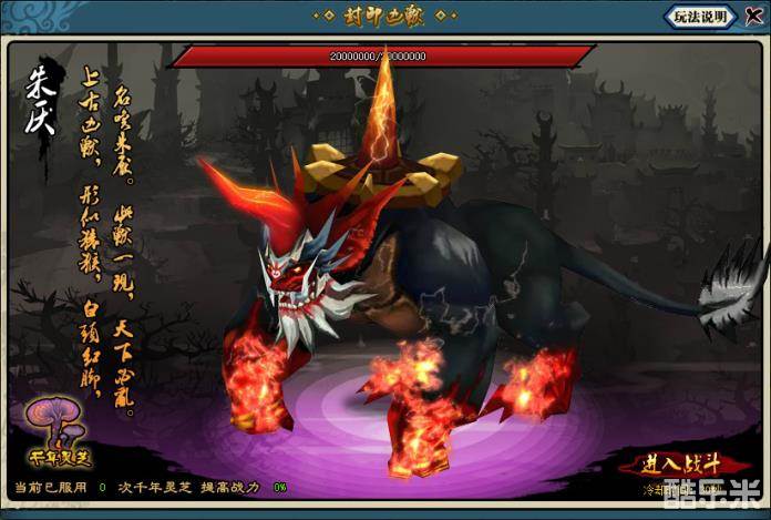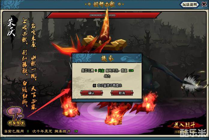 在封印凶兽的战斗中,输出是最重要的,所以玩家应尽量选择飞羽类型的神将出战。若是玩家还想在己方最高输出的基础上再提升战力,还可以在战斗之前服用千年灵芝。每服用1次千年灵芝,玩家可以提升10%的战力。每次挑战只可服用1次千年灵芝,但是灵芝的效果可以延续到下次挑战中,如果下次挑战玩家再服用千年灵芝的话,战力会在原先提升的基础上再增加10%。