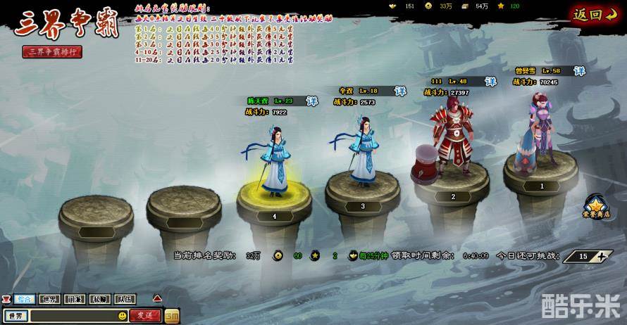 每天玩家最多可以挑战15次三界争霸,每次都有5个对手可以选择。在挑选对手时,玩家可点击对手上方的“详”字来了解对方的详情,然后再根据对方的战力情况来决定是否要挑战。在主动挑战他人时,玩家失败不会出现名次降低的情况,即便对方的名次比自己低。