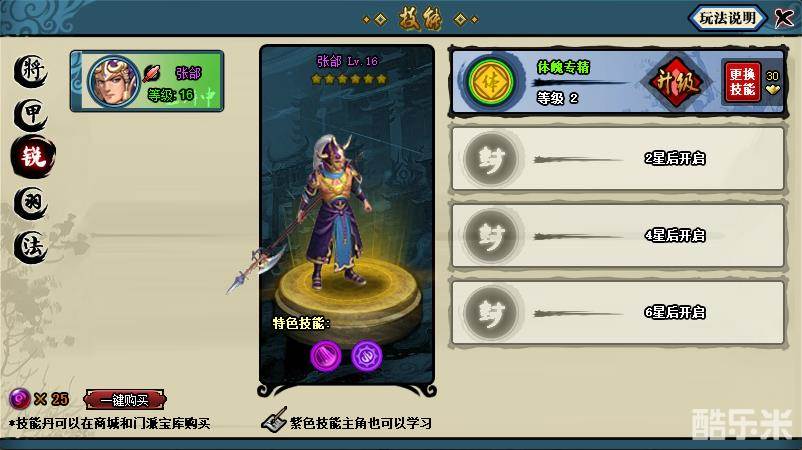 每个神将都有自己的特色技能,当这些特色技能成为神将的出战技能时,可提升神将的实际战力,提高战斗获胜几率。使用元宝刷新可更换技能,当特色技能变为出战技能后,玩家再升级技能可大大提升神将战力。