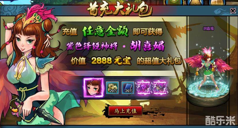 活动神将可通过参与限时活动或充值活动来获得。比如作为反派大boss的纣王、妲己,就是充值大礼赠送的,而千年雉鸡精胡喜媚则是首充大礼包中的主要奖品。其中最易获得的活动神将就是胡喜媚,只需充值任意金额即可获取,并能同时得到超强神将和大量铜钱、阅历。