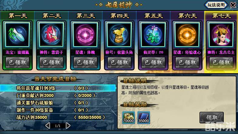 完成七日封神的目标玩家可以得到两个神将,雷震子和龙吉公主。雷震子是飞羽型神将,单位输出较高;而龙吉公主则是具有治疗潜能的控法型神将,综合资质很高,可在获得专属法宝后转职奶妈。虽然在刚开始战斗时,这个奶妈看起来没那么重要,但随着关卡难度的上升,她在团队中的作用就会慢慢显现出来。