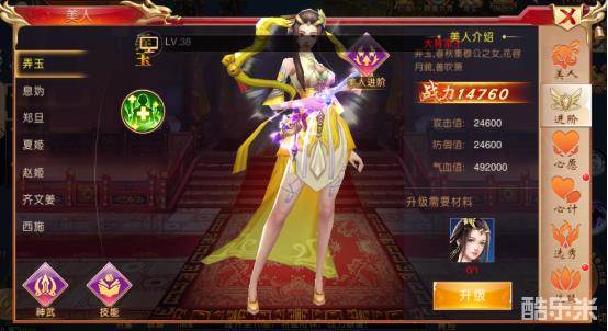 通过美人激活卡激活美人,选择美人进行出战(只能选择一个)。不同美人属性不同,并拥有独特的技能。